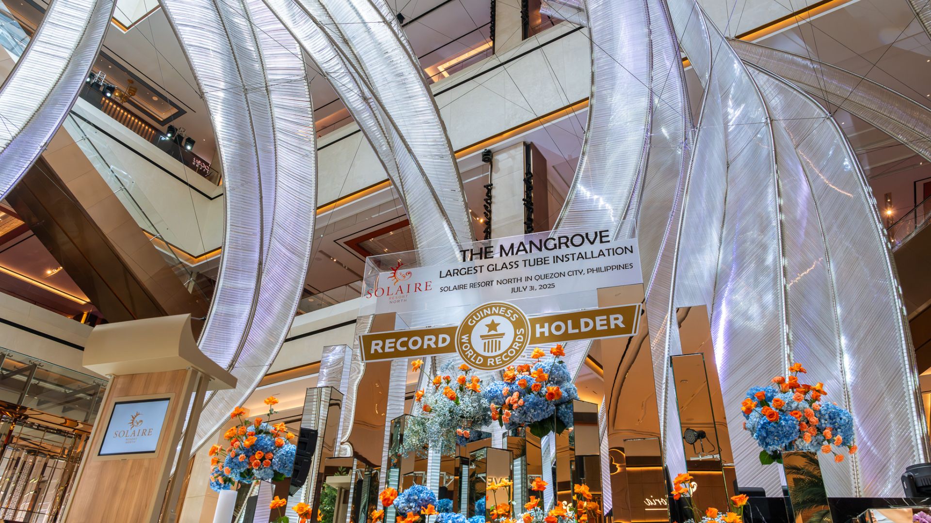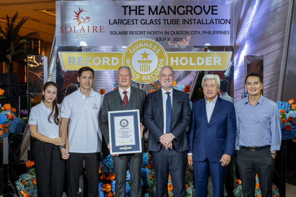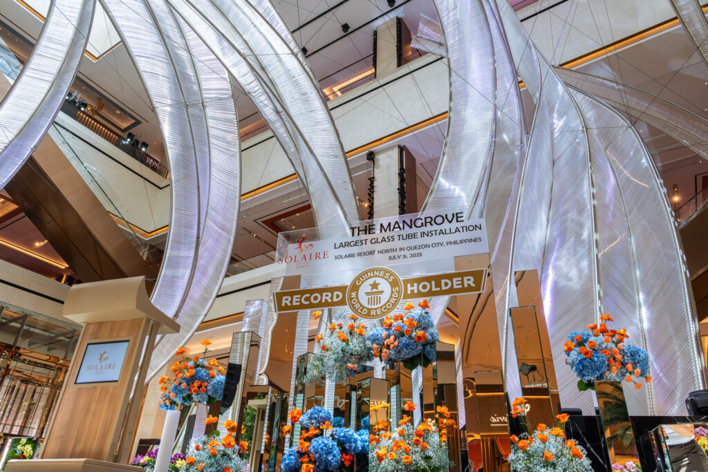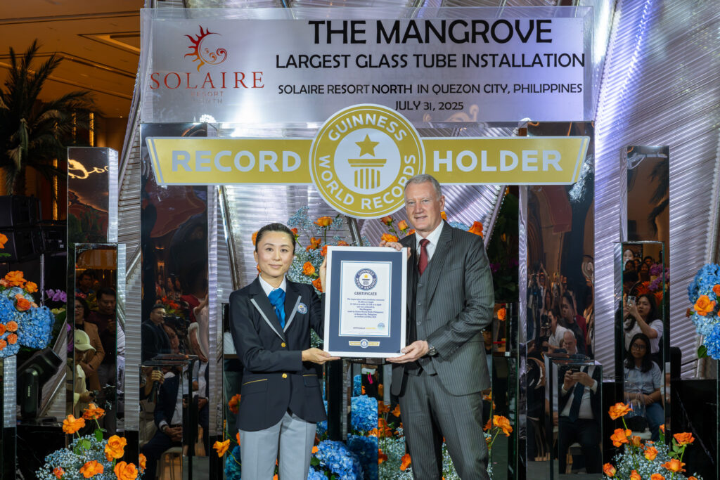 Solaire Resort North is proud to announce that they are the record holder for the GUINNESS WORLD RECORD title the Largest Glass Tube Installation, The Mangrove. The event was witnessed by hundreds of employees and guests who gathered in the resort’s grand lobby to celebrate this momentous achievement.